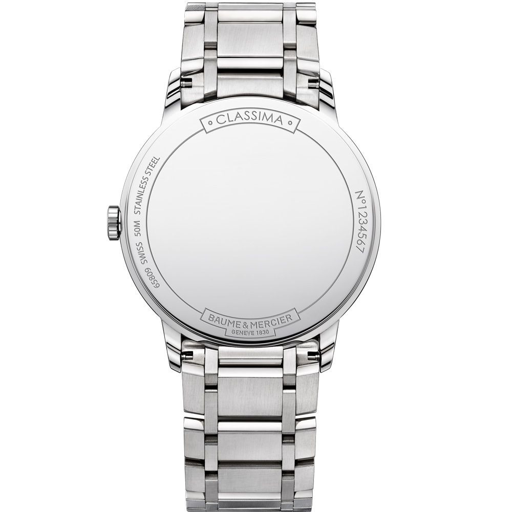 A Baume & Mercier Classima férfi karóra M0A10382 karóra házának anyaga Nemesacél, színe Ezüst, a szíjának anyaga Nemesacél és a színe Ezüst. Az óratok átmérője 40 mm, alakja Kerek. A karóra üvege Zafír (karcolásmentes), szerkezete Kvarc és vízállósága 5 atm (50m) (erősen cseppálló).