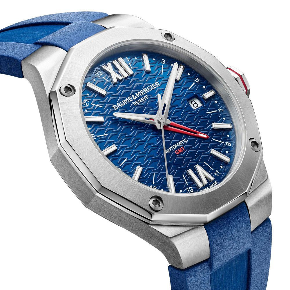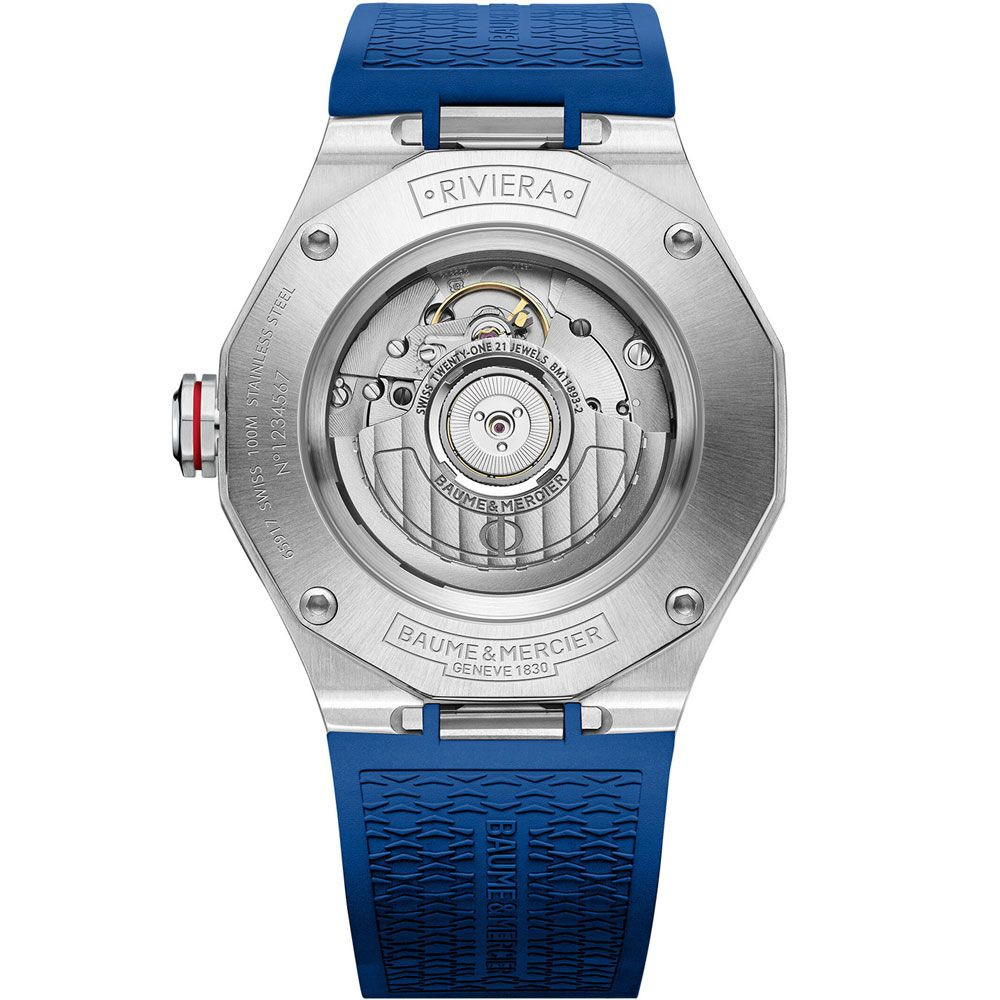 A Baume & Mercier Riviera GMT férfi karóra M0A10659 karóra házának anyaga Nemesacél, színe Ezüst, a szíjának anyaga Szilikon és a színe Kék. Az óratok átmérője 42 mm, alakja Kerek. A karóra üvege Zafír (karcolásmentes), szerkezete Automata és vízállósága 10 atm (100m) (úszásra is alkalmas).