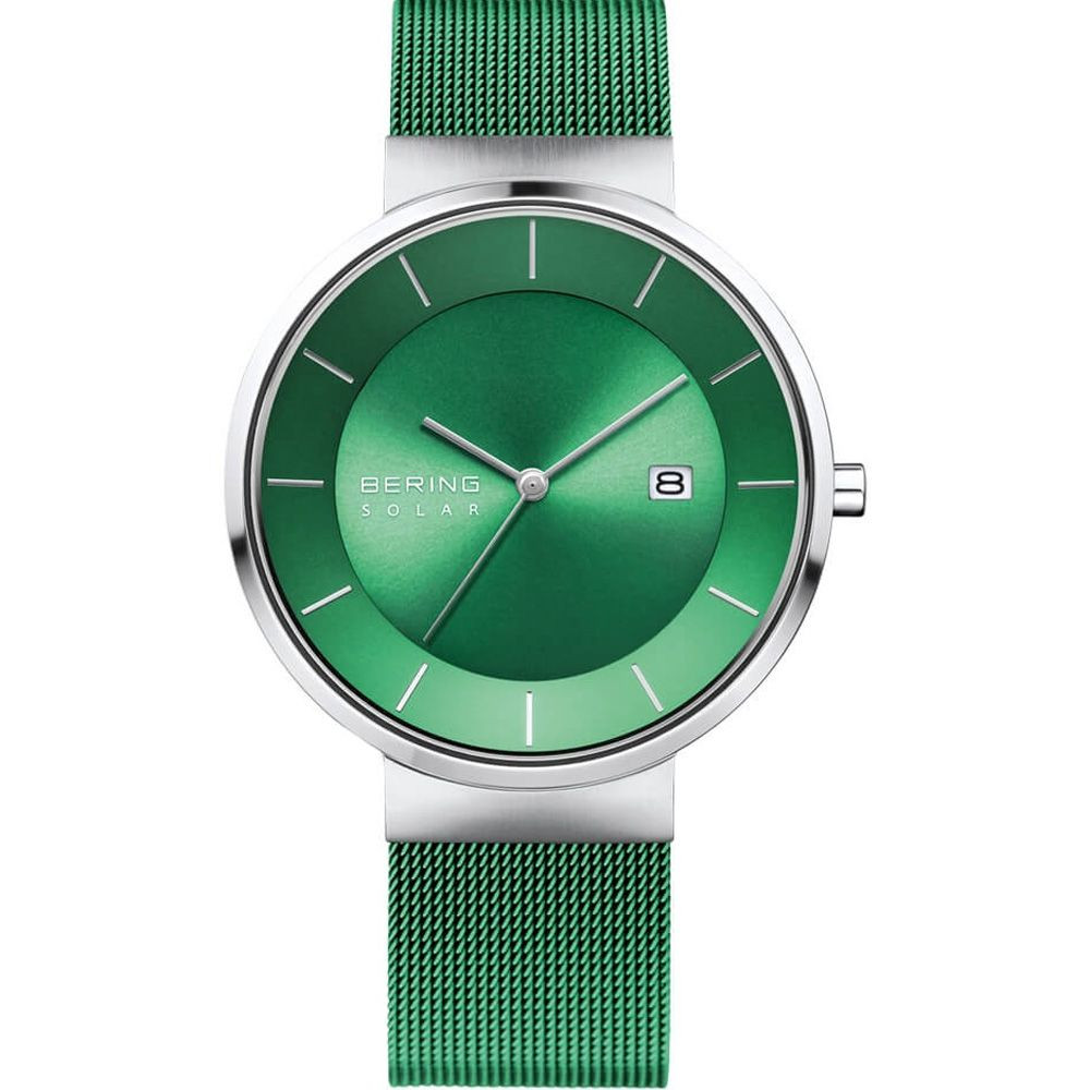 A Bering Charity férfi karóra 14639-CHARITY karóra házának anyaga Nemesacél, színe Ezüst, a szíjának anyaga Nemesacél és a színe Zöld. Az óratok átmérője 39 mm, alakja Kerek. A karóra üvege Zafír (karcolásmentes), szerkezete Solar és vízállósága 5 atm (50m) (erősen cseppálló).