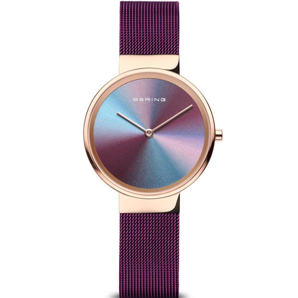 A Bering Classic Anniversary női karóra ANNIVERSARY3 karóra házának anyaga Nemesacél, színe Rose gold, a szíjának anyaga Nemesacél és a színe Lila. Az óratok átmérője 31 mm, alakja Kerek. A karóra üvege Zafír (karcolásmentes), szerkezete Kvarc és vízállósága 5 atm (50m) (erősen cseppálló).