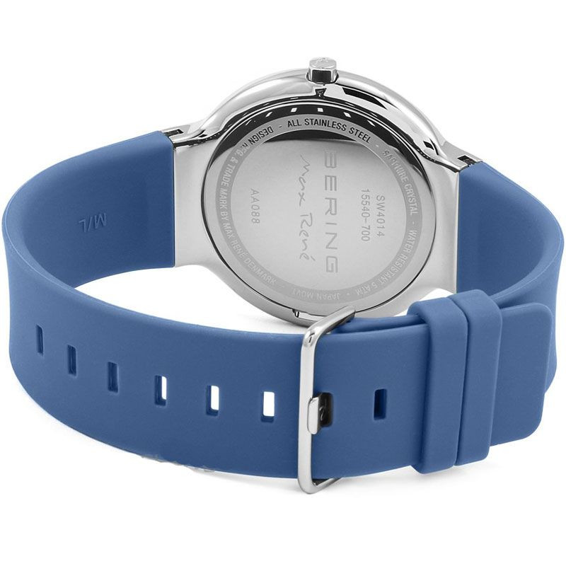 A Bering Max Rene férfi karóra 15540-700 karóra házának anyaga Nemesacél, színe Ezüst, a szíjának anyaga Szilikon és a színe Kék. Az óratok átmérője 40 mm, alakja Kerek. A karóra üvege Zafír (karcolásmentes), szerkezete Kvarc és vízállósága 5 atm (50m) (erősen cseppálló).