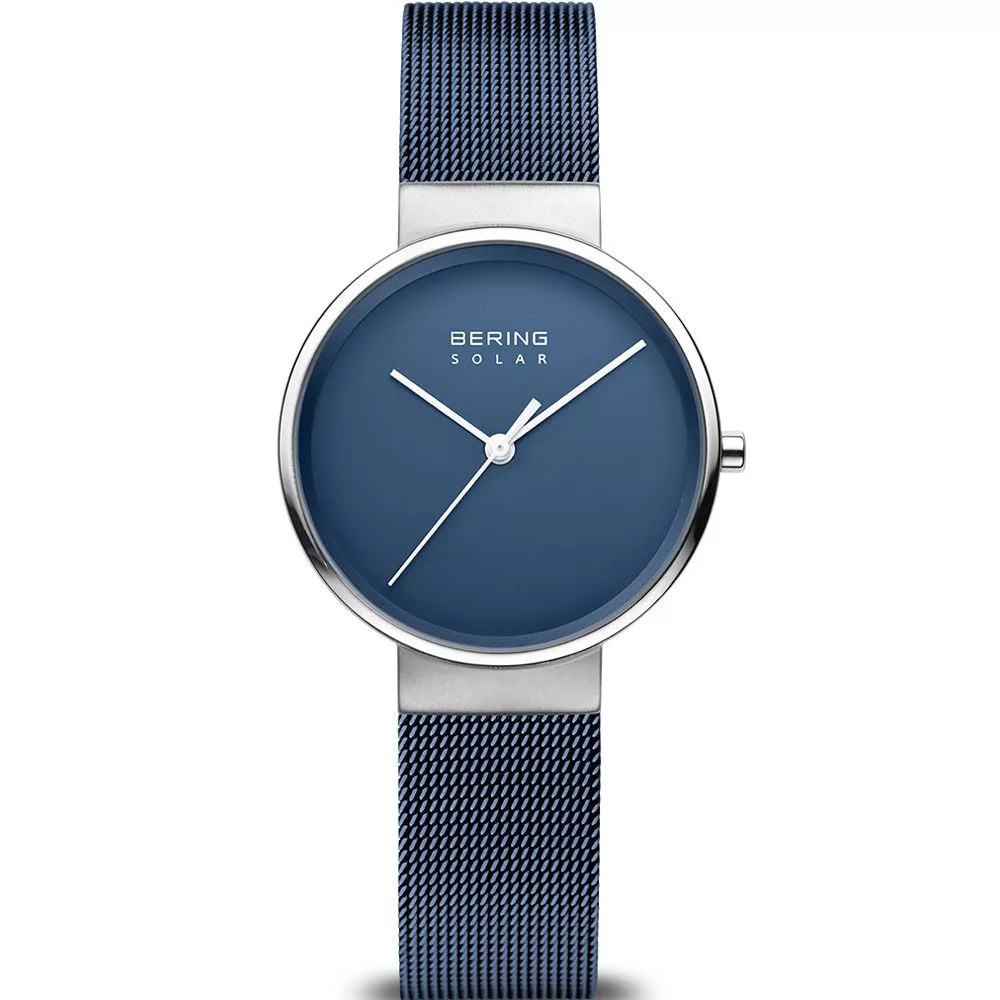 A Bering Solar női karóra 14331-307 karóra házának anyaga Nemesacél, színe Ezüst, a szíjának anyaga Nemesacél és a színe Kék. Az óratok átmérője 31 mm, alakja Kerek. A karóra üvege Zafír (karcolásmentes), szerkezete Solar és vízállósága 5 atm (50m) (erősen cseppálló).