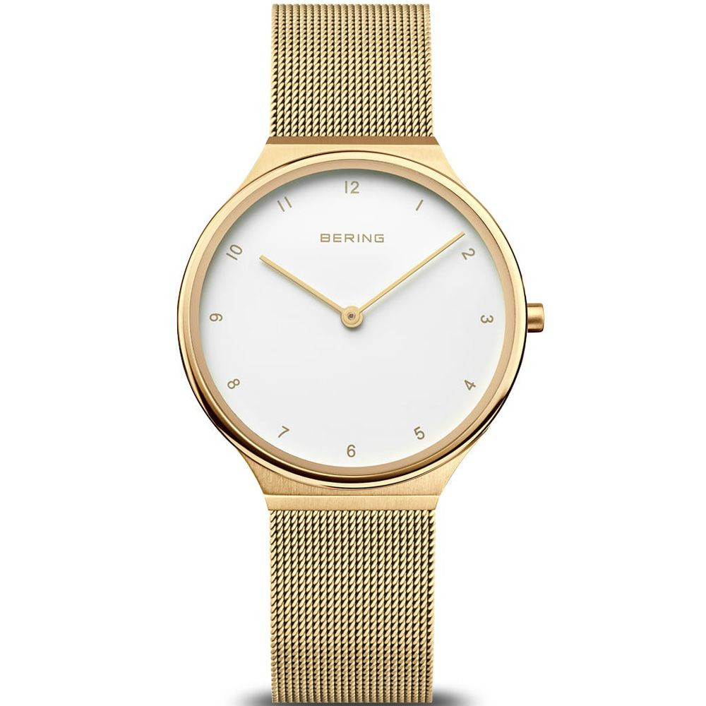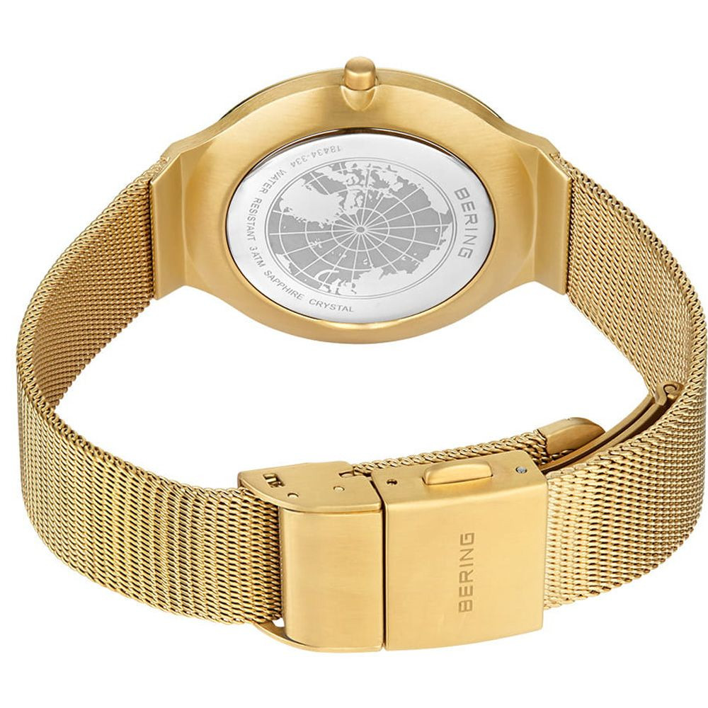 A Bering Ultra Slim női karóra 18434-334 karóra házának anyaga Nemesacél, színe Arany, a szíjának anyaga Nemesacél és a színe Arany. Az óratok átmérője 34 mm, alakja Kerek. A karóra üvege Zafír (karcolásmentes), szerkezete Kvarc és vízállósága 3 atm (30m) (cseppmentes).