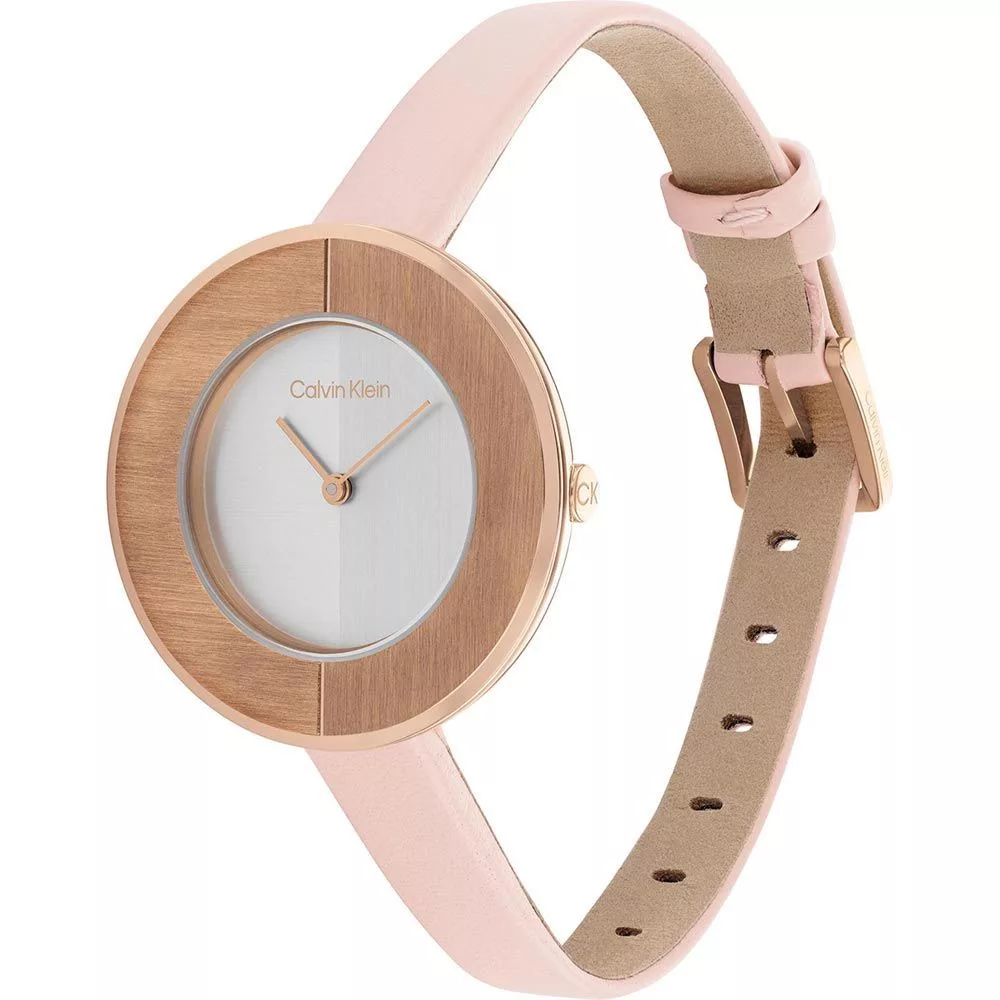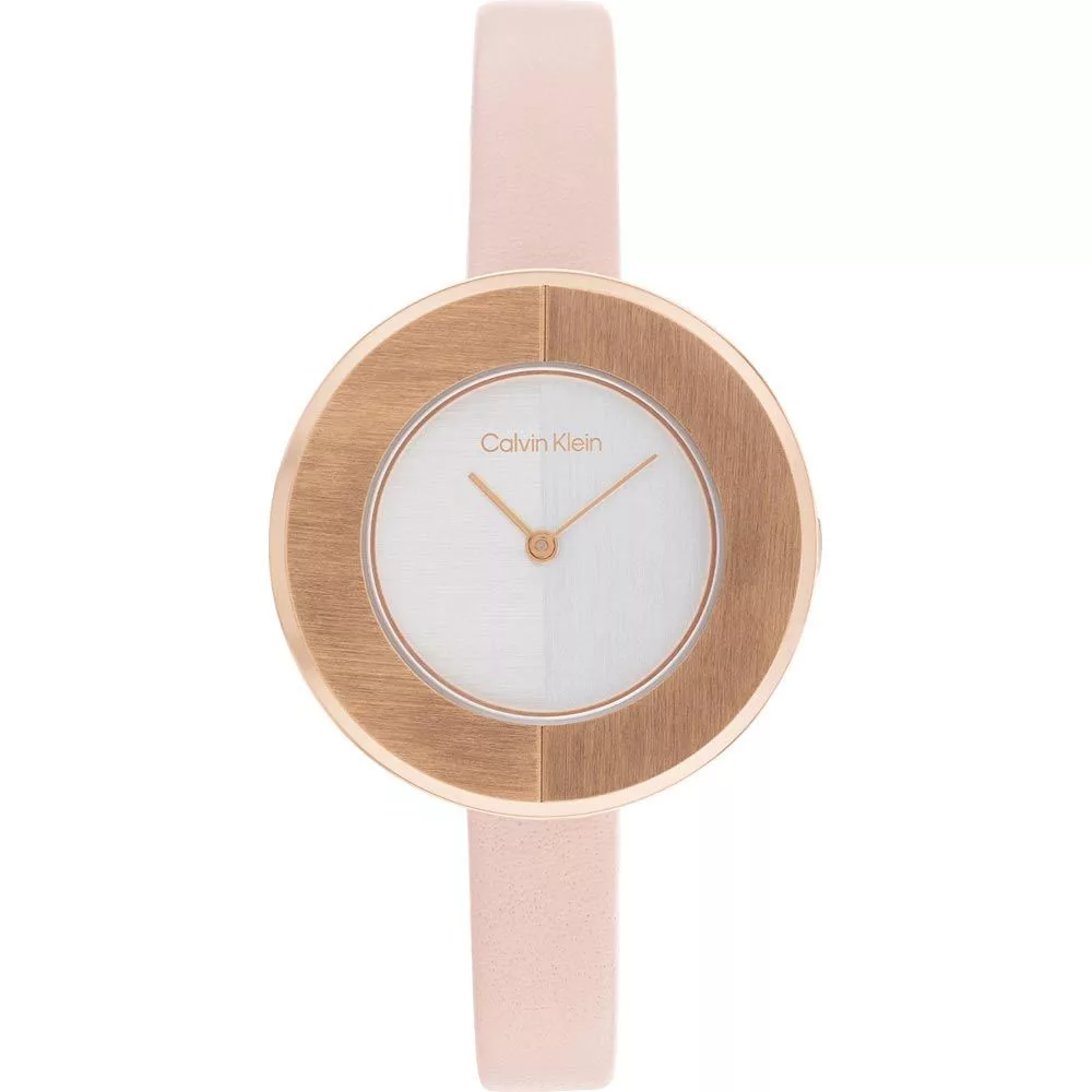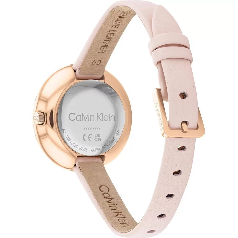 A Calvin Klein Sculptural Confidence női karóra CK25200025 karóra házának anyaga Nemesacél, színe Rose gold, a szíjának anyaga Bőr és a színe Rózsaszín. Az óratok átmérője 32 mm, alakja Kerek. A karóra üvege Kristály (nehezen karcolható), szerkezete Kvarc és vízállósága 3 atm (30m) (cseppmentes).