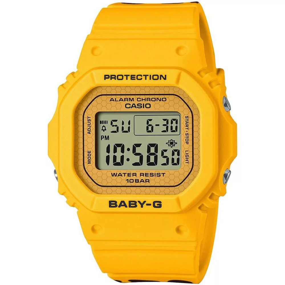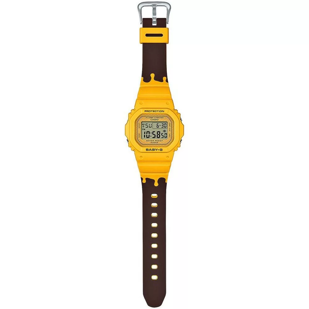 A Casio Baby-G Summer Lover Honey Series női karóra BGD-565SLC-9ER karóra házának anyaga Műanyag, színe Sárga, a szíjának anyaga Műanyag és a színe Barna,Sárga. Az óratok átmérője 38 mm, alakja Négyszögű. A karóra üvege Kristály (nehezen karcolható), szerkezete Kvarc és vízállósága 20 atm (200m) (búvárkodásra is alkalmas).