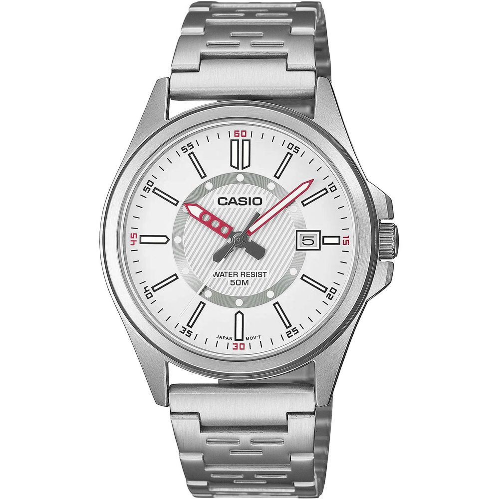 A Casio Collection férfi karóra MTP-E700D-7EVEF karóra házának anyaga Nemesacél, színe Ezüst, a szíjának anyaga Nemesacél és a színe Ezüst. Az óratok átmérője 40 mm, alakja Kerek. A karóra üvege Kristály (nehezen karcolható), szerkezete Kvarc és vízállósága 5 atm (50m) (erősen cseppálló).