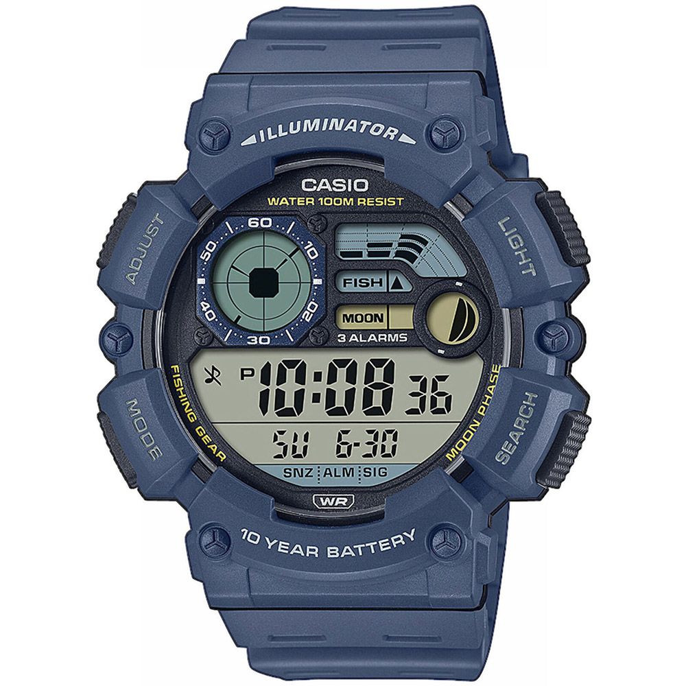 A Casio Collection férfi karóra WS-1500H-2AVEF karóra házának anyaga Műanyag, színe Kék, a szíjának anyaga Műanyag és a színe Kék. Az óratok átmérője 50 mm, alakja Kerek. A karóra üvege Plexi (műanyag), szerkezete Kvarc és vízállósága 10 atm (100m) (úszásra is alkalmas).