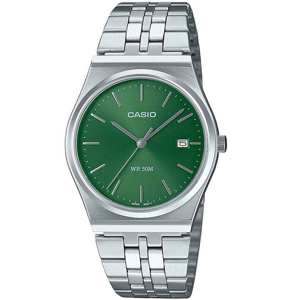A Casio Collection unisex karóra MTP-B145D-3AVEF karóra házának anyaga Nemesacél, színe Ezüst, a szíjának anyaga Nemesacél és a színe Ezüst. Az óratok átmérője 35 mm, alakja Kerek. A karóra üvege Kristály (nehezen karcolható), szerkezete Kvarc és vízállósága 5 atm (50m) (erősen cseppálló).