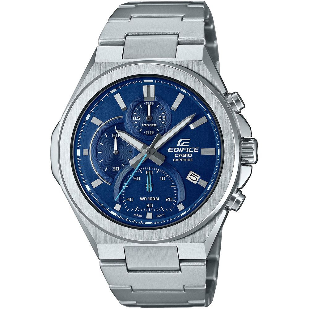 A Casio Edifice férfi karóra EFB-700D-2AVUEF karóra házának anyaga Nemesacél, színe Ezüst, a szíjának anyaga Nemesacél és a színe Ezüst. Az óratok átmérője 45 mm, alakja Kerek. A karóra üvege Zafír (karcolásmentes), szerkezete Kvarc és vízállósága 10 atm (100m) (úszásra is alkalmas).