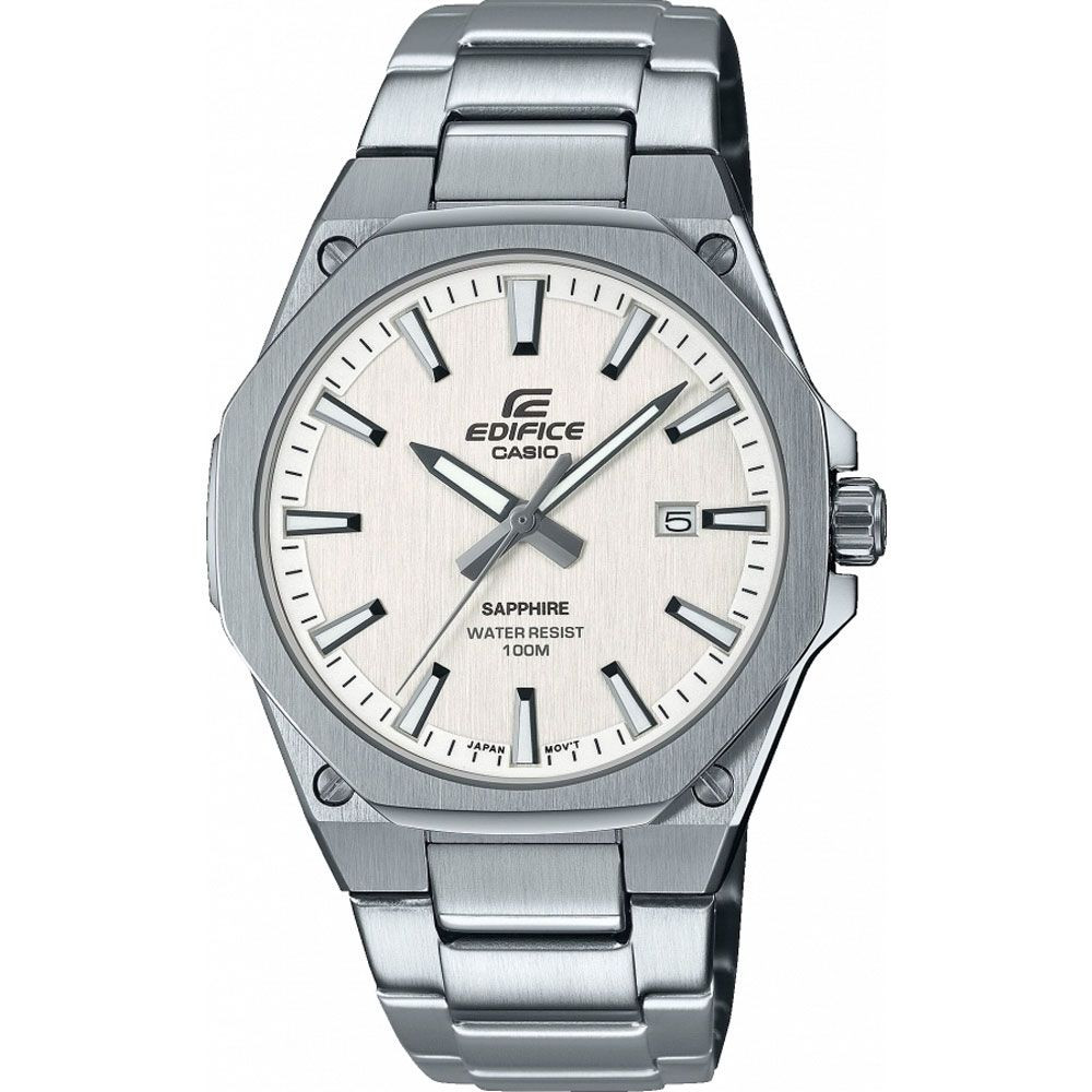 A Casio Edifice férfi karóra EFR-S108D-7AVUEF karóra házának anyaga Nemesacél, színe Ezüst, a szíjának anyaga Nemesacél és a színe Ezüst. Az óratok átmérője 40 mm, alakja Kerek. A karóra üvege Zafír (karcolásmentes), szerkezete Kvarc és vízállósága 10 atm (100m) (úszásra is alkalmas).
