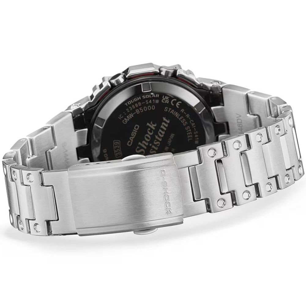 A Casio G-Shock 40th Anniversary Limited Edition férfi karóra GMW-B5000PC-1ER karóra házának anyaga Nemesacél, színe Ezüst, a szíjának anyaga Nemesacél és a színe Ezüst. Az óratok átmérője 43 mm, alakja Négyszögű. A karóra üvege Kristály (nehezen karcolható), szerkezete Solar és vízállósága 20 atm (200m) (búvárkodásra is alkalmas).