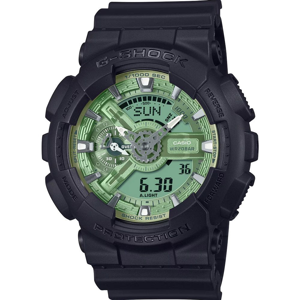 A Casio G-Shock férfi karóra GA-110CD-1A3ER karóra házának anyaga Műanyag, színe Fekete, a szíjának anyaga Műanyag és a színe Fekete. Az óratok átmérője 51 mm, alakja Kerek. A karóra üvege Kristály (nehezen karcolható), szerkezete Kvarc és vízállósága 20 atm (200m) (búvárkodásra is alkalmas).