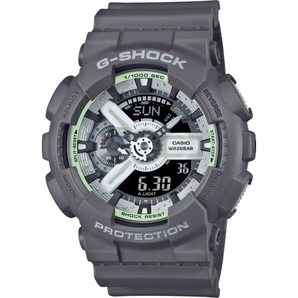 A Casio G-Shock férfi karóra GA-110HD-8AER karóra házának anyaga Műanyag, színe Szürke, a szíjának anyaga Műanyag és a színe Szürke. Az óratok átmérője 51 mm, alakja Kerek. A karóra üvege Kristály (nehezen karcolható), szerkezete Kvarc és vízállósága 20 atm (200m) (búvárkodásra is alkalmas).