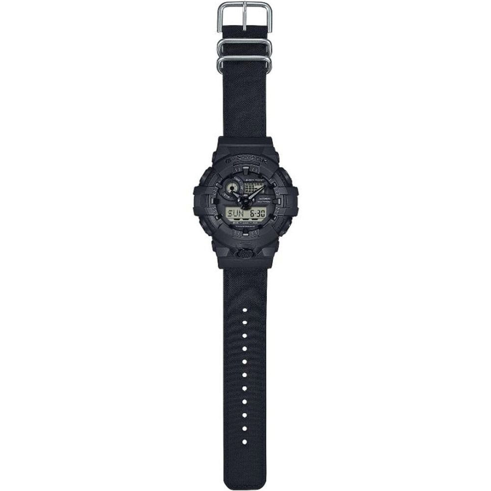 A Casio G-Shock férfi karóra GA-700BCE-1AER karóra házának anyaga Műanyag, színe Fekete, a szíjának anyaga Szövet és a színe Fekete. Az óratok átmérője 53 mm, alakja Kerek. A karóra üvege Kristály (nehezen karcolható), szerkezete Kvarc és vízállósága 20 atm (200m) (búvárkodásra is alkalmas).