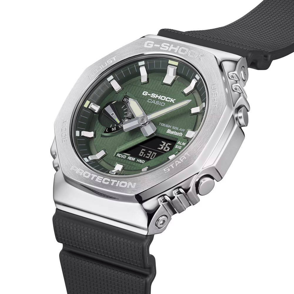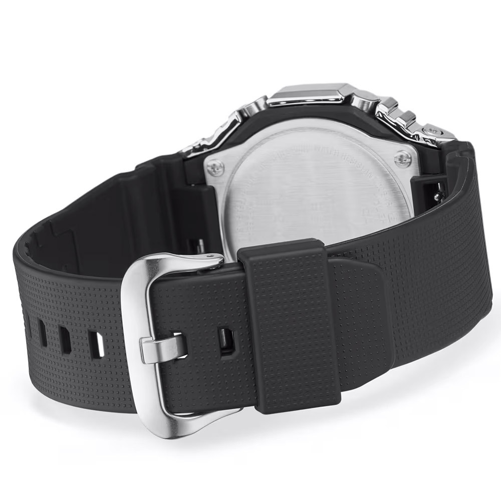 A Casio G-Shock férfi karóra GBM-2100A-1A3ER karóra házának anyaga nemesacél, színe ezüst, a szíjának anyaga műanyag és a színe fekete. Az óratok átmérője 44 mm, alakja kerek. A karóra üvege kristály (nehezen karcolható), szerkezete és vízállósága 20 atm (200m) (búvárkodásra is alkalmas).