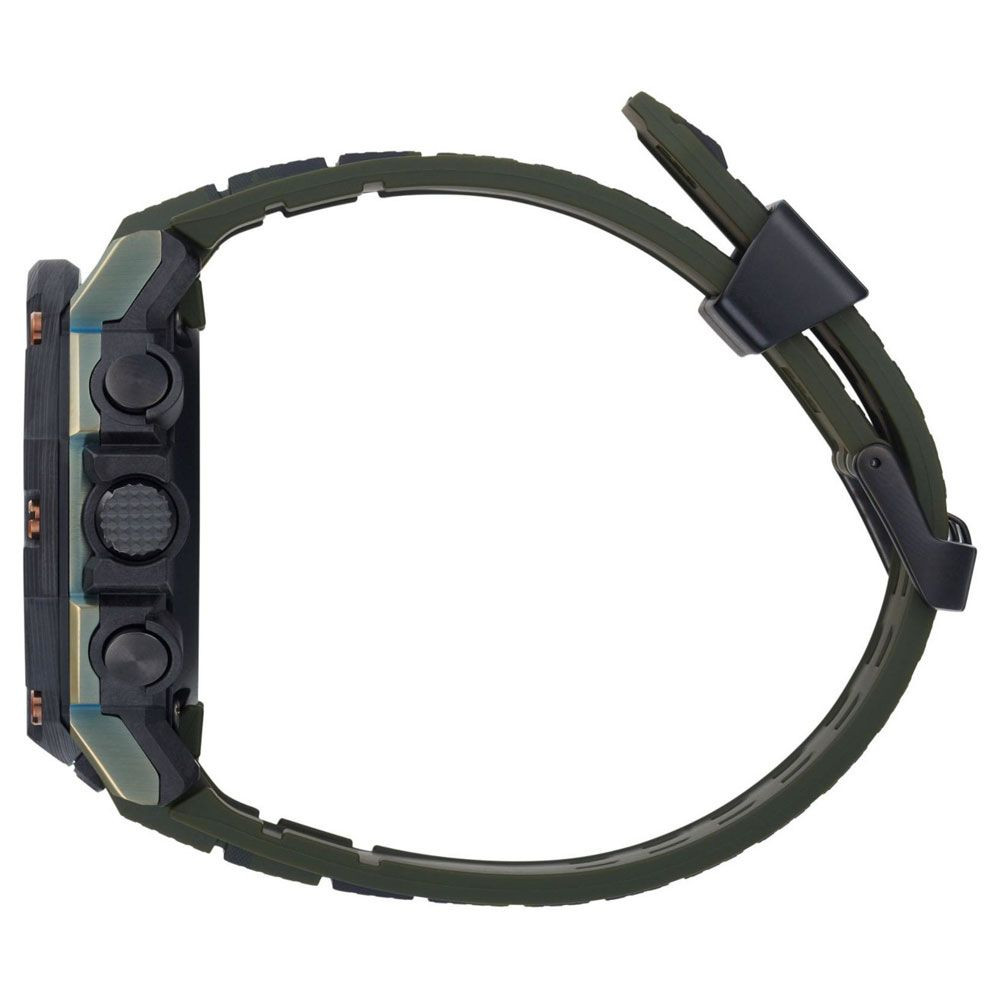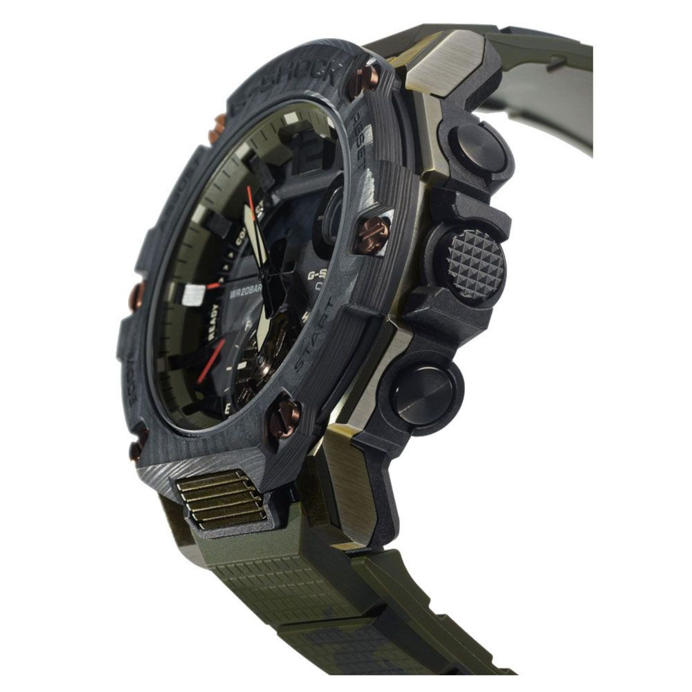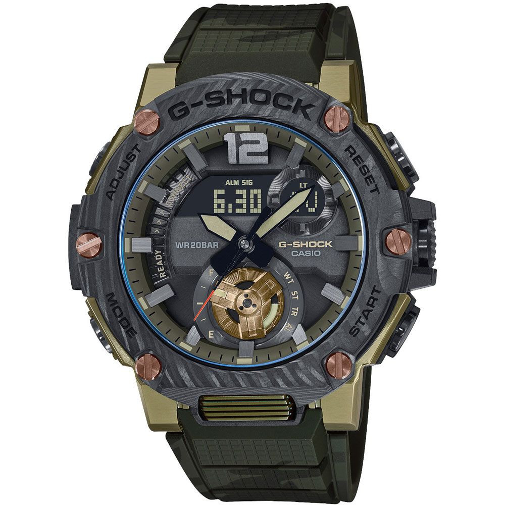 A Casio G-Shock férfi karóra GST-B300XB-1A3ER karóra házának anyaga Nemesacél,Műanyag, színe Bronz,Fekete, a szíjának anyaga Műanyag és a színe Fekete,Zöld. Az óratok átmérője 51 mm, alakja Kerek. A karóra üvege Zafír (karcolásmentes), szerkezete Solar és vízállósága 20 atm (200m) (búvárkodásra is alkalmas).