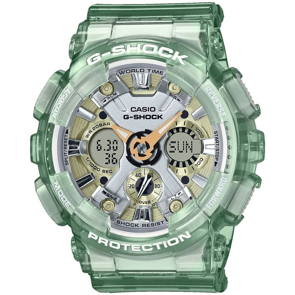 A Casio G-Shock női karóra GMA-S120GS-3AER karóra házának anyaga Műanyag, színe Zöld, a szíjának anyaga Műanyag és a színe Zöld. Az óratok átmérője 46 mm, alakja Kerek. A karóra üvege Kristály (nehezen karcolható), szerkezete Kvarc és vízállósága 20 atm (200m) (búvárkodásra is alkalmas).
