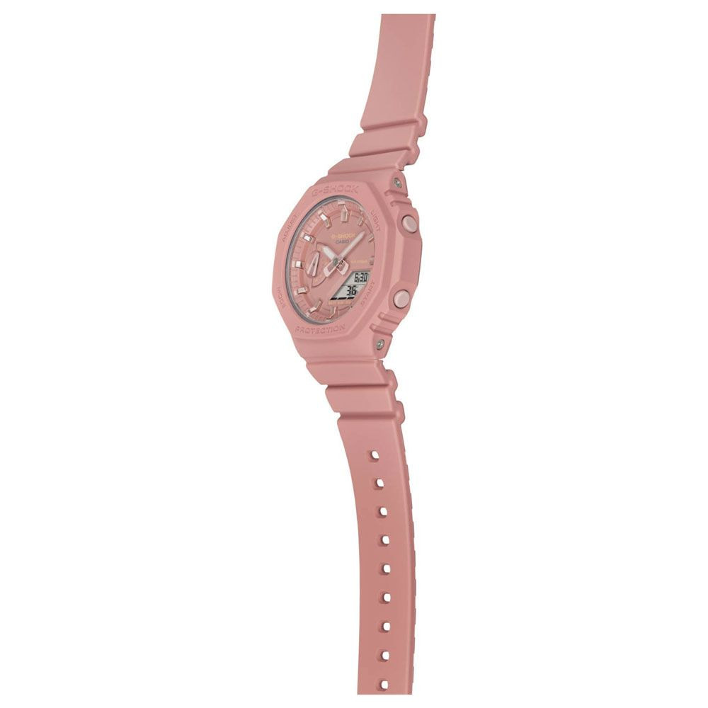 A Casio G-Shock női karóra GMA-S2100-4A2ER karóra házának anyaga Műanyag, színe Rózsaszín, a szíjának anyaga Műanyag és a színe Rózsaszín. Az óratok átmérője 43 mm, alakja Kerek. A karóra üvege Kristály (nehezen karcolható), szerkezete Kvarc és vízállósága 20 atm (200m) (búvárkodásra is alkalmas).
