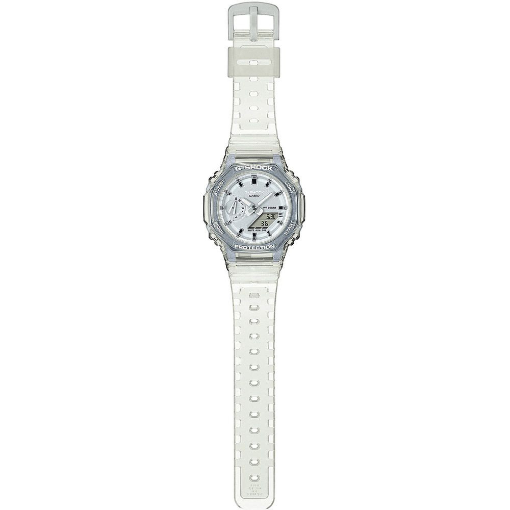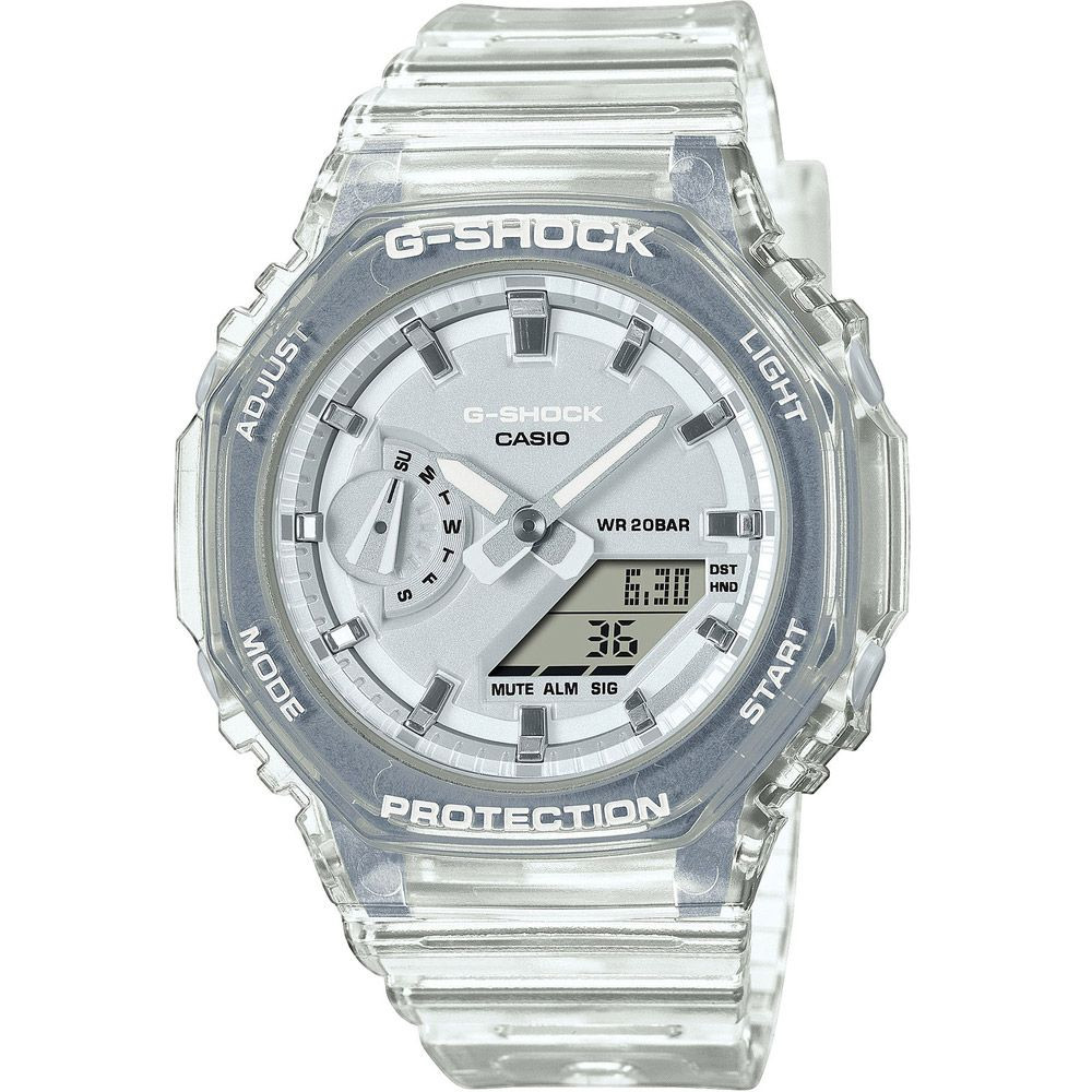 A Casio G-Shock női karóra GMA-S2100SK-7AER karóra házának anyaga Műanyag, színe Átlátszó, a szíjának anyaga Műanyag és a színe Átlátszó. Az óratok átmérője 42 mm, alakja Kerek. A karóra üvege Kristály (nehezen karcolható), szerkezete Kvarc és vízállósága 20 atm (200m) (búvárkodásra is alkalmas).