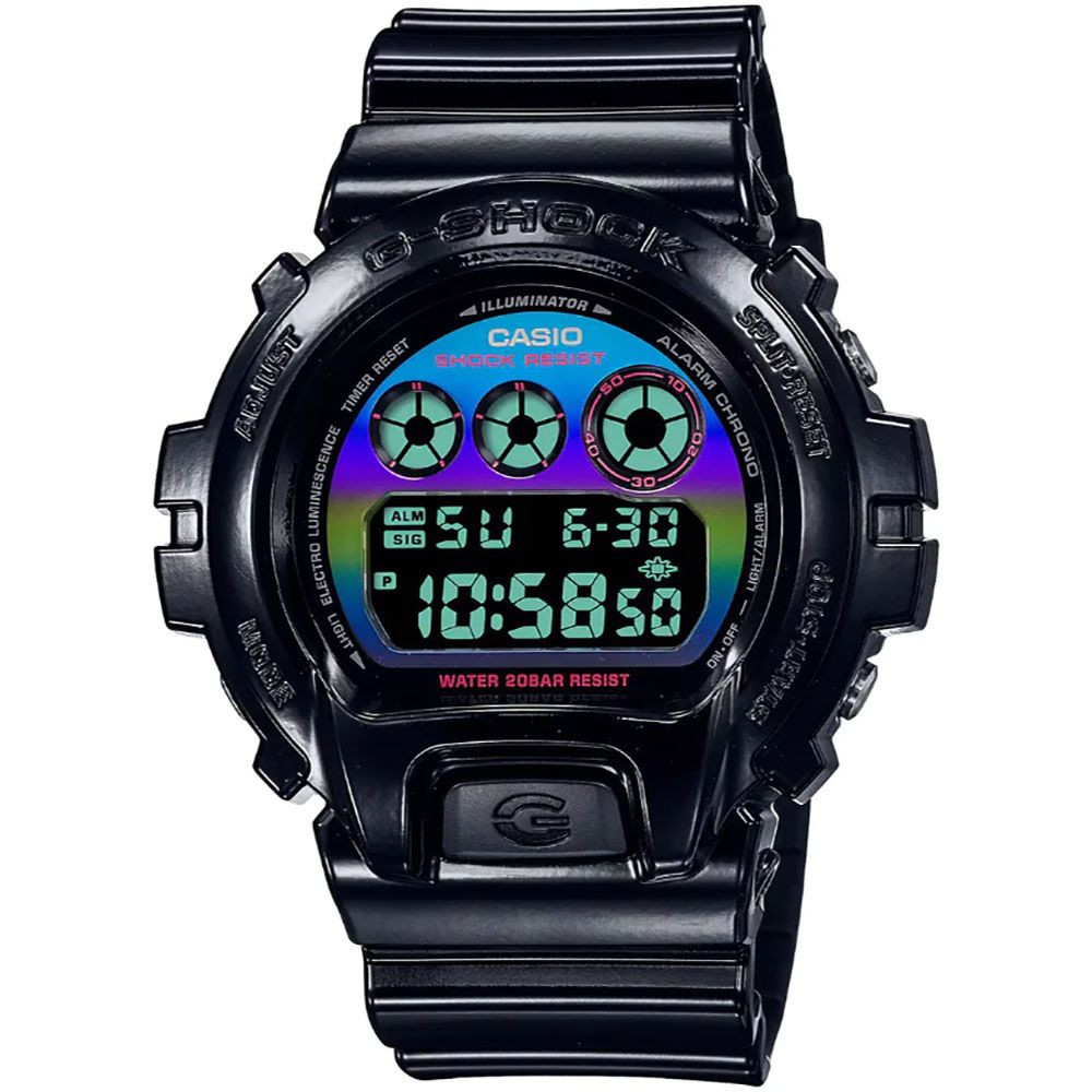 A Casio G-Shock Virtual Rainbow férfi karóra DW-6900RGB-1ER karóra házának anyaga Műanyag, színe Fekete, a szíjának anyaga Műanyag és a színe Fekete. Az óratok átmérője 50 mm, alakja Kerek. A karóra üvege Kristály (nehezen karcolható), szerkezete Kvarc és vízállósága 20 atm (200m) (búvárkodásra is alkalmas).
