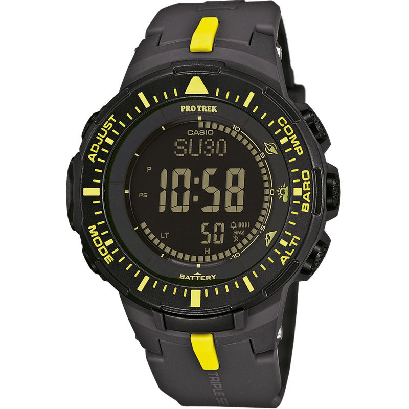 A Casio Pro Trek férfi karóra PRG-300-1A9ER karóra házának anyaga Műanyag, színe Fekete, a szíjának anyaga Műanyag és a színe Fekete. Az óratok átmérője 47 mm, alakja Kerek. A karóra üvege Kristály (nehezen karcolható), szerkezete Solar és vízállósága 10 atm (100m) (úszásra is alkalmas).