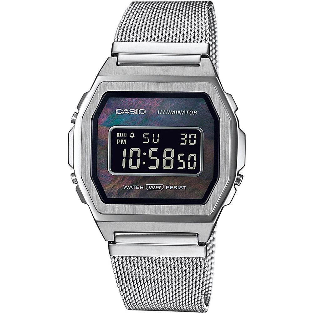 A Casio Vintage női karóra A1000M-1BEF karóra házának anyaga Nemesacél, színe Ezüst, a szíjának anyaga Nemesacél és a színe Ezüst. Az óratok átmérője 40 mm, alakja Négyszögű. A karóra üvege Kristály (nehezen karcolható), szerkezete Kvarc és vízállósága 3 atm (30m) (cseppmentes).