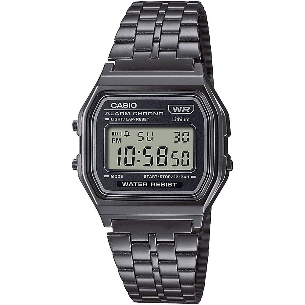 A Casio Vintage női karóra A158WETB-1AEF karóra házának anyaga Műanyag, színe Szürke, a szíjának anyaga Nemesacél és a színe Szürke. Az óratok átmérője 34 mm, alakja Négyszögű. A karóra üvege Plexi (műanyag), szerkezete Kvarc és vízállósága 3 atm (30m) (cseppmentes).