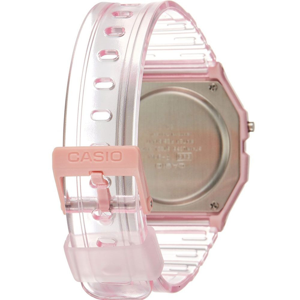 A Casio Vintage női karóra F-91WS-4EF karóra házának anyaga Műanyag, színe Rózsaszín, a szíjának anyaga Műanyag és a színe Átlátszó,Rózsaszín. Az óratok átmérője 33 mm, alakja Négyszögű. A karóra üvege Plexi (műanyag), szerkezete Kvarc és vízállósága 3 atm (30m) (cseppmentes).