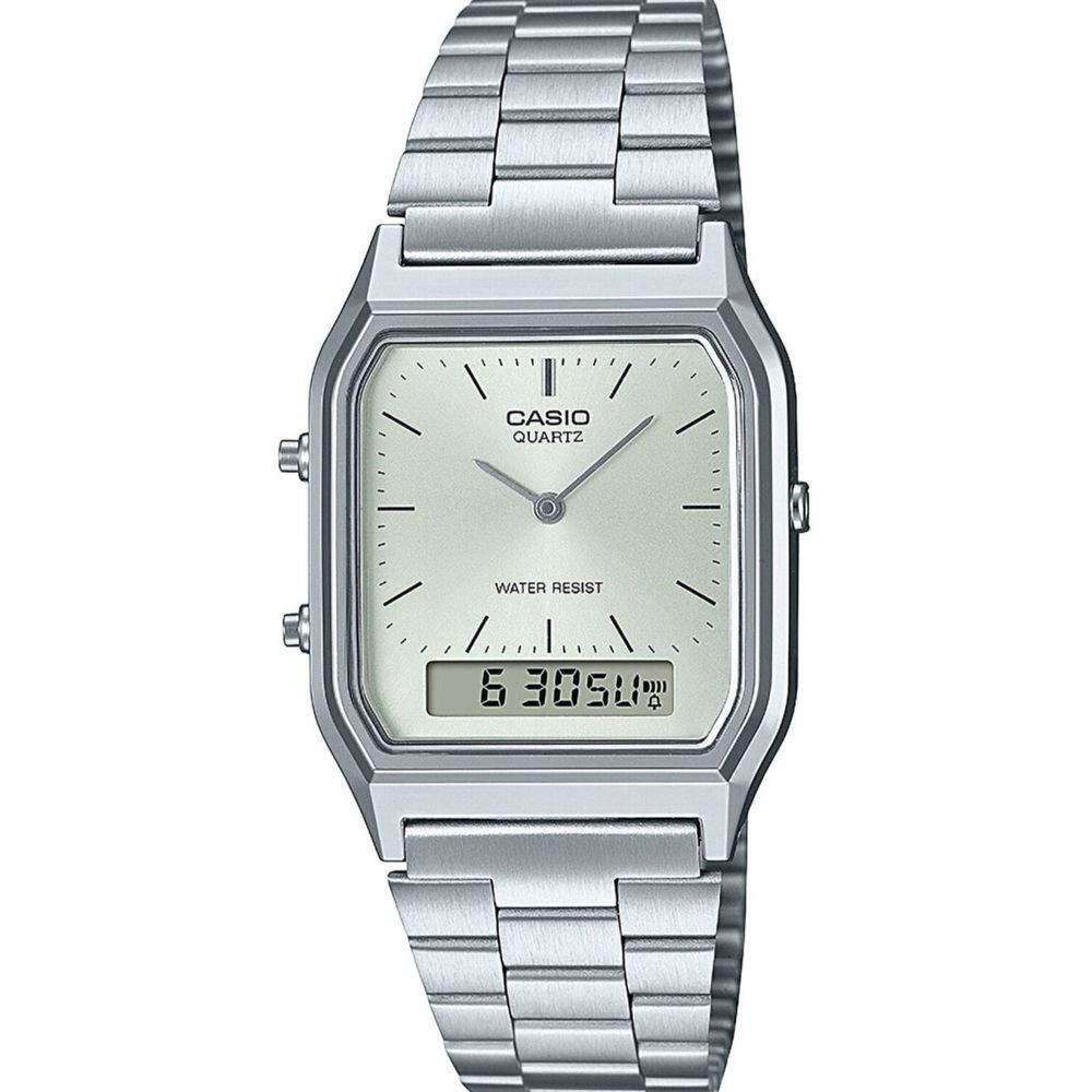 A Casio Vintage unisex karóra AQ-230A-7AMQYES karóra házának anyaga Műanyag, színe Ezüst, a szíjának anyaga Nemesacél és a színe Ezüst. Az óratok átmérője 38 mm, alakja Négyszögű. A karóra üvege Plexi (műanyag), szerkezete Kvarc és vízállósága 3 atm (30m) (cseppmentes).