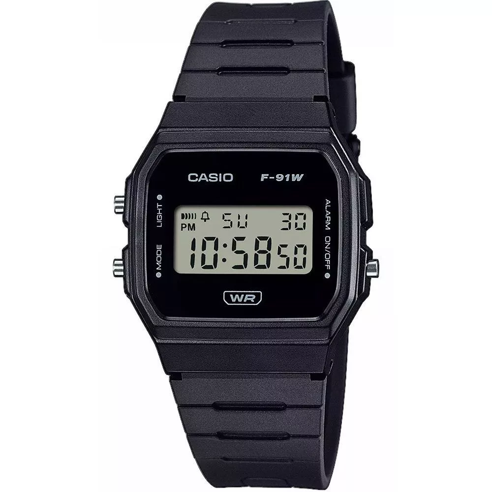 A Casio Vintage unisex karóra F-91WB-1AEF karóra házának anyaga Műanyag, színe Fekete, a szíjának anyaga Műanyag és a színe Fekete. Az óratok átmérője 35 mm, alakja Négyszögű. A karóra üvege Plexi (műanyag), szerkezete Kvarc és vízállósága 3 atm (30m) (cseppmentes).