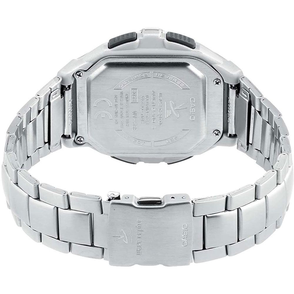 A Casio Wave Ceptor férfi karóra WV-58RD-1AEF karóra házának anyaga Műanyag, színe Ezüst, a szíjának anyaga Nemesacél és a színe Ezüst. Az óratok átmérője 44 mm, alakja Kerek. A karóra üvege Plexi (műanyag), szerkezete Kvarc és vízállósága 5 atm (50m) (erősen cseppálló).