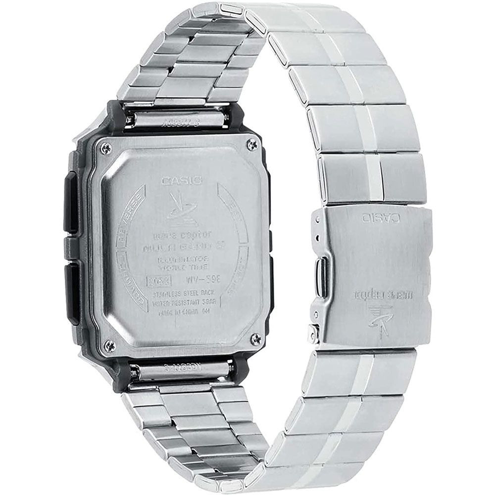 A Casio Wave Ceptor férfi karóra WV-59RD-1AEF karóra házának anyaga Nemesacél,Műanyag, színe Ezüst, a szíjának anyaga Nemesacél és a színe Ezüst. Az óratok átmérője 39 mm, alakja Négyszögű. A karóra üvege Plexi (műanyag), szerkezete Kvarc és vízállósága 5 atm (50m) (erősen cseppálló).