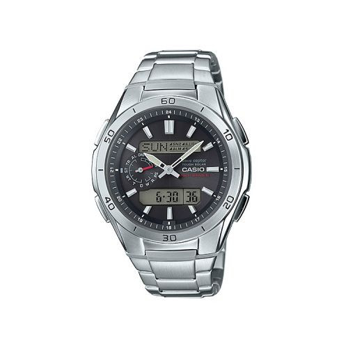 A Casio Wave Ceptor férfi karóra WVA-M650D-1AER karóra házának anyaga , színe Ezüst, a szíjának anyaga Nemesacél és a színe Ezüst. Az óratok átmérője 45 mm, alakja Kerek. A karóra üvege Plexi (műanyag), szerkezete Solar és vízállósága 5 atm (50m) (erősen cseppálló).