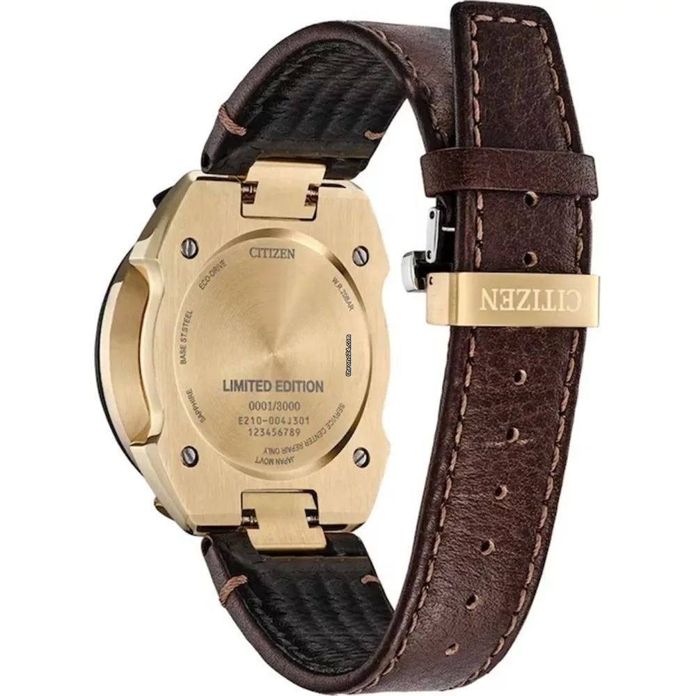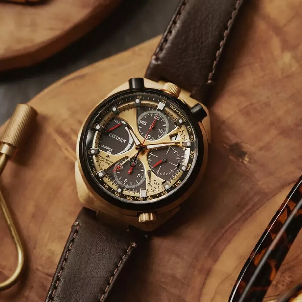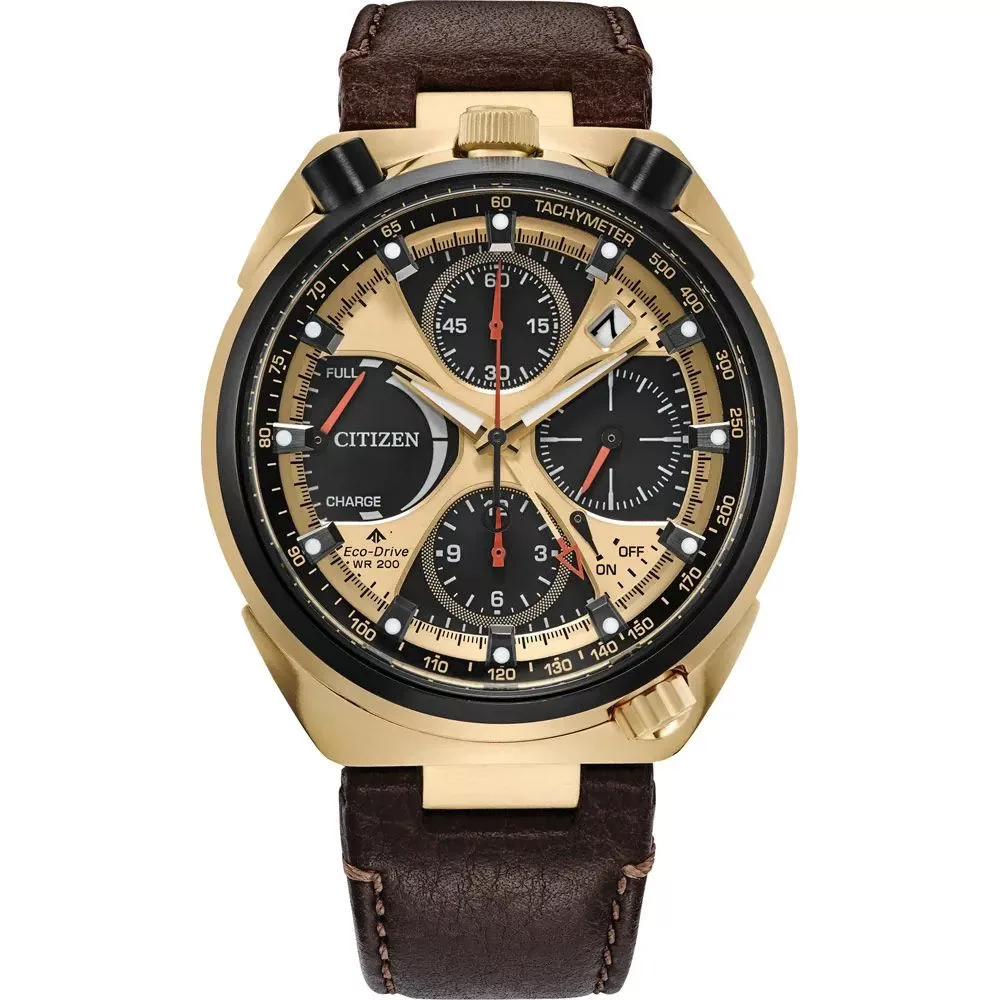 A Citizen Promaster Land Bullhead Tsuno Chrono Racer 50th Anniversary Limited Edition férfi karóra AV0072-01X karóra házának anyaga Nemesacél, színe Arany, a szíjának anyaga Bőr és a színe Barna. Az óratok átmérője 45 mm, alakja Kerek. A karóra üvege Zafír (karcolásmentes), szerkezete Solar és vízállósága 10 atm (100m) (úszásra is alkalmas).