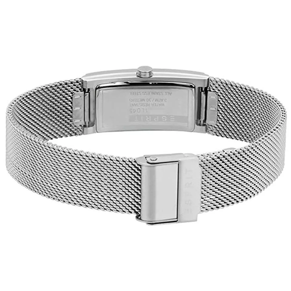 Az Esprit Houston Blaze női karóra ES1L045M0025 karóra házának anyaga Nemesacél, színe Ezüst, a szíjának anyaga Nemesacél és a színe Ezüst. Az óratok átmérője 20 mm, alakja Négyszögű. A karóra üvege Kristály (nehezen karcolható), szerkezete Kvarc és vízállósága 3 atm (30m) (cseppmentes).