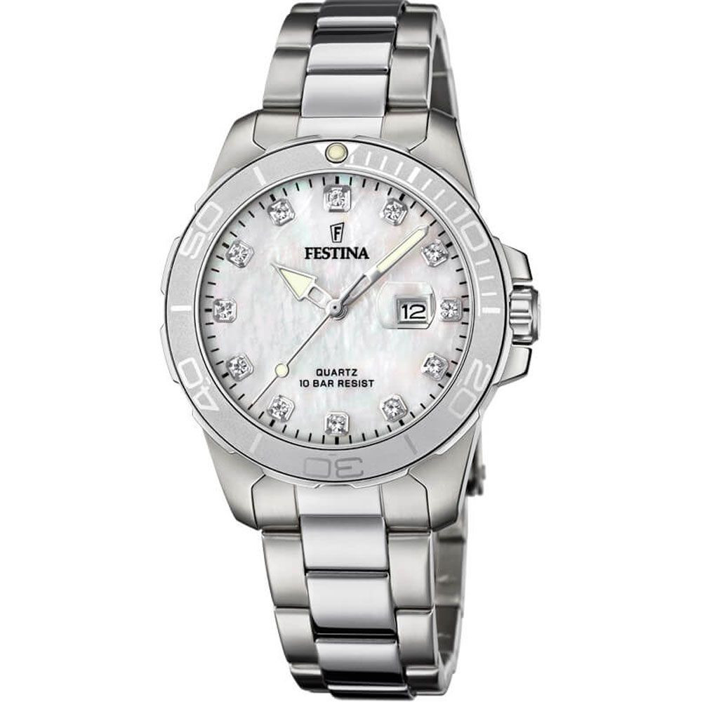 A Festina Boyfriend női karóra F20503/1 karóra házának anyaga Nemesacél, színe Ezüst, a szíjának anyaga Nemesacél és a színe Ezüst. Az óratok átmérője 35 mm, alakja Kerek. A karóra üvege Kristály (nehezen karcolható), szerkezete Kvarc és vízállósága 10 atm (100m) (úszásra is alkalmas).