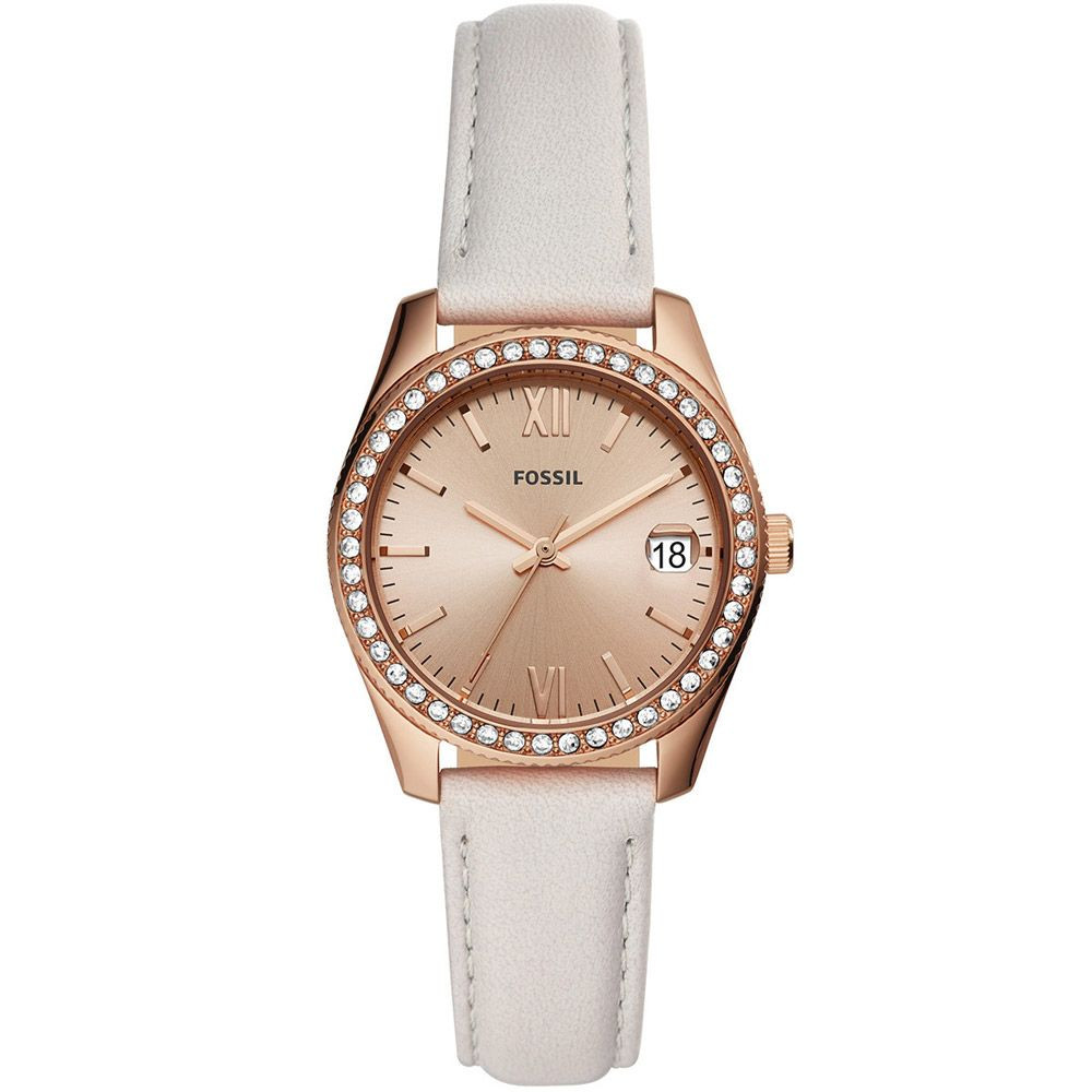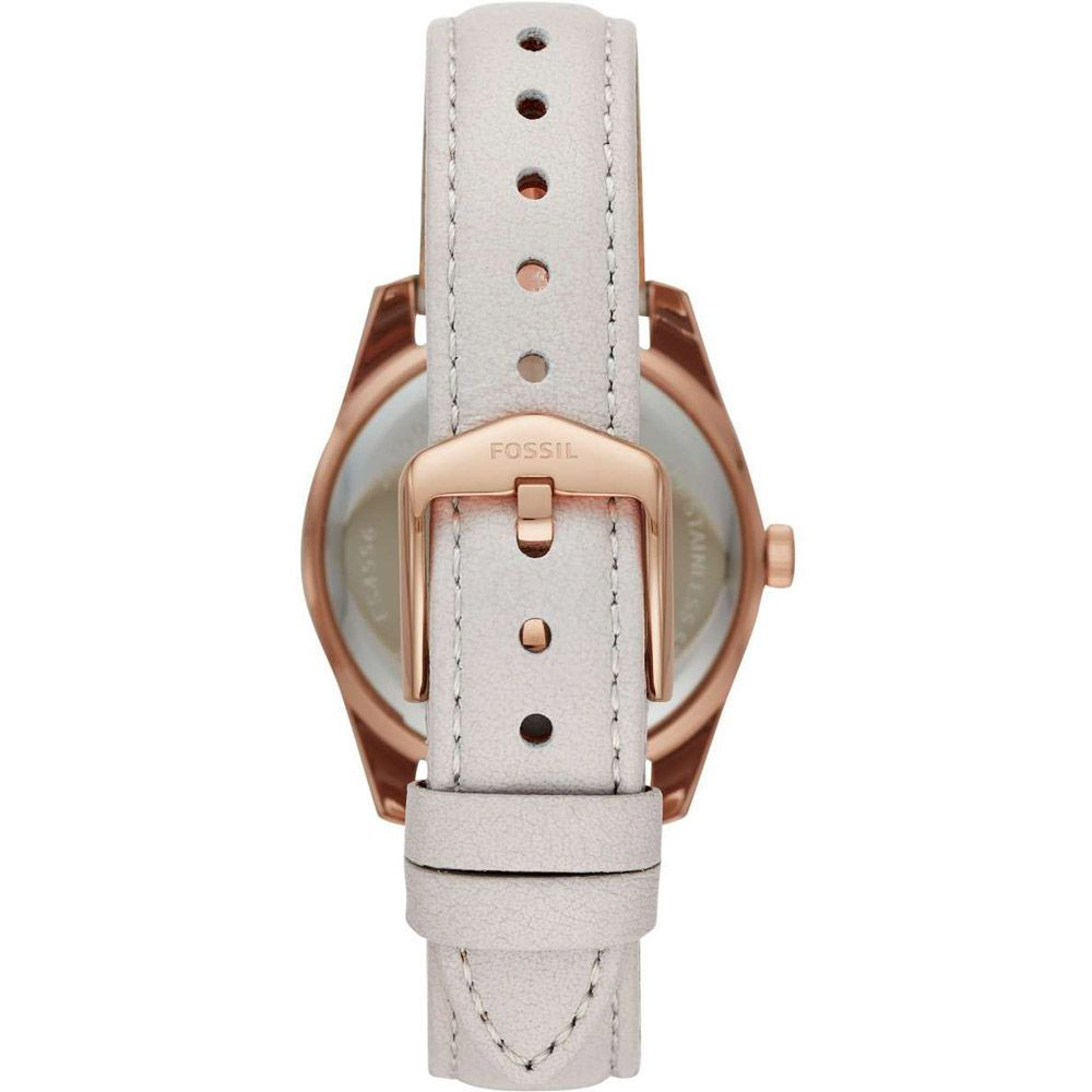A Fossil Scarlette Mini női karóra ES4556 karóra házának anyaga Nemesacél, színe Rose gold, a szíjának anyaga Bőr és a színe Fehér. Az óratok átmérője 32 mm, alakja Kerek. A karóra üvege Kristály (nehezen karcolható), szerkezete Kvarc és vízállósága 5 atm (50m) (erősen cseppálló).