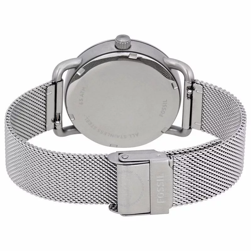 A Fossil The Commuter női karóra ES4331 karóra házának anyaga Nemesacél, színe Ezüst, a szíjának anyaga Nemesacél és a színe Ezüst. Az óratok átmérője 34 mm, alakja Kerek. A karóra üvege Kristály (nehezen karcolható), szerkezete Kvarc és vízállósága 5 atm (50m) (erősen cseppálló).