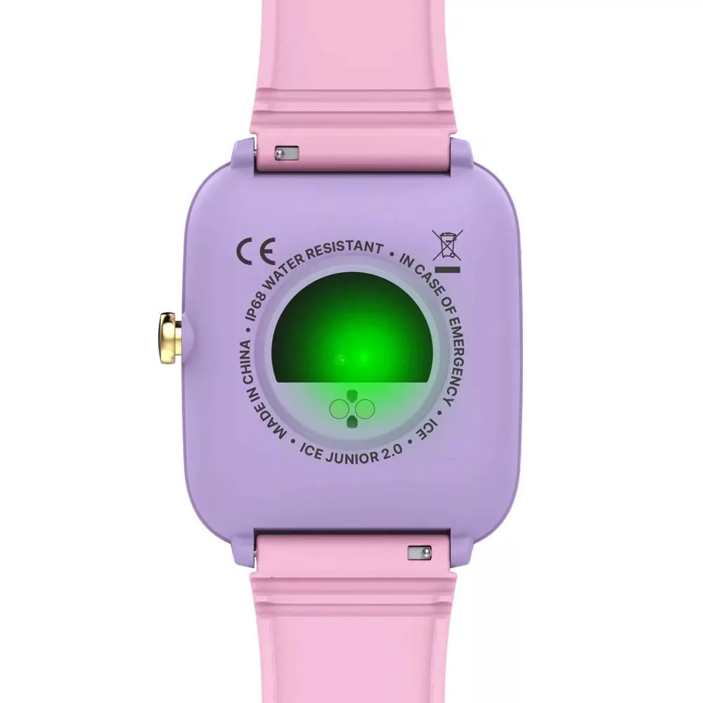 Az Ice Watch Smart 2.0 Purple Pink gyerek okosóra 36mm 022799 karóra házának anyaga Műanyag, színe Lila, a szíjának anyaga Szilikon és a színe Rózsaszín. Az óratok átmérője 36 mm, alakja Négyszögű. A karóra üvege Kristály (nehezen karcolható), szerkezete Kvarc és vízállósága 3 atm (30m) (cseppmentes).