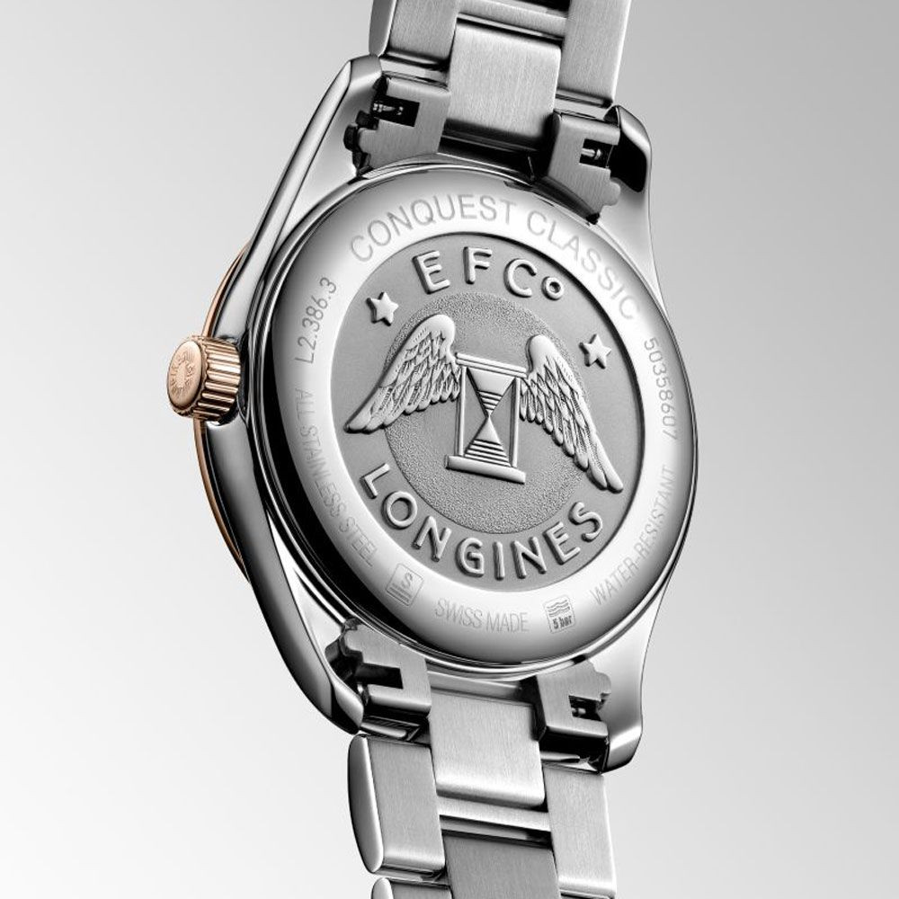 A Longines Conquest Classic női karóra L2.386.3.72.7 karóra házának anyaga Nemesacél, színe Ezüst, a szíjának anyaga Nemesacél és a színe Ezüst,Rose gold. Az óratok átmérője 34 mm, alakja Kerek. A karóra üvege Zafír (karcolásmentes), szerkezete Kvarc és vízállósága 5 atm (50m) (erősen cseppálló).