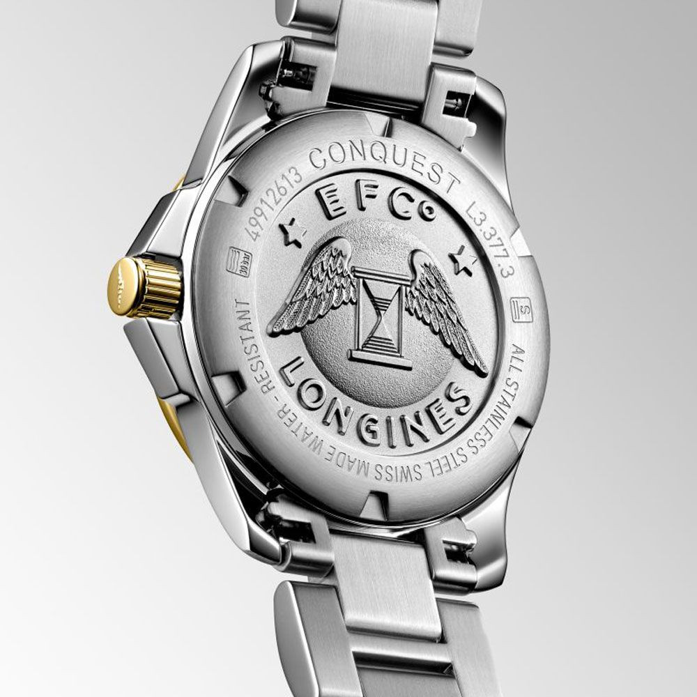 A Longines Conquest női karóra L3.377.3.87.7 karóra házának anyaga Nemesacél, színe Arany,Ezüst, a szíjának anyaga Nemesacél és a színe Arany,Ezüst. Az óratok átmérője 34 mm, alakja Kerek. A karóra üvege Zafír (karcolásmentes), szerkezete Kvarc és vízállósága 30 atm (300m) (búvárkodásra is alkalmas).