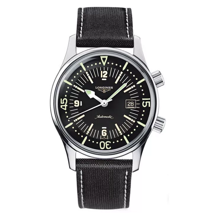A Longines Legend Diver férfi karóra L3.674.4.50.0 karóra házának anyaga Nemesacél, színe Ezüst, a szíjának anyaga Szövet és a színe Fekete. Az óratok átmérője 42 mm, alakja Kerek. A karóra üvege Zafír (karcolásmentes), szerkezete Automata és vízállósága 30 atm (300m) (búvárkodásra is alkalmas).
