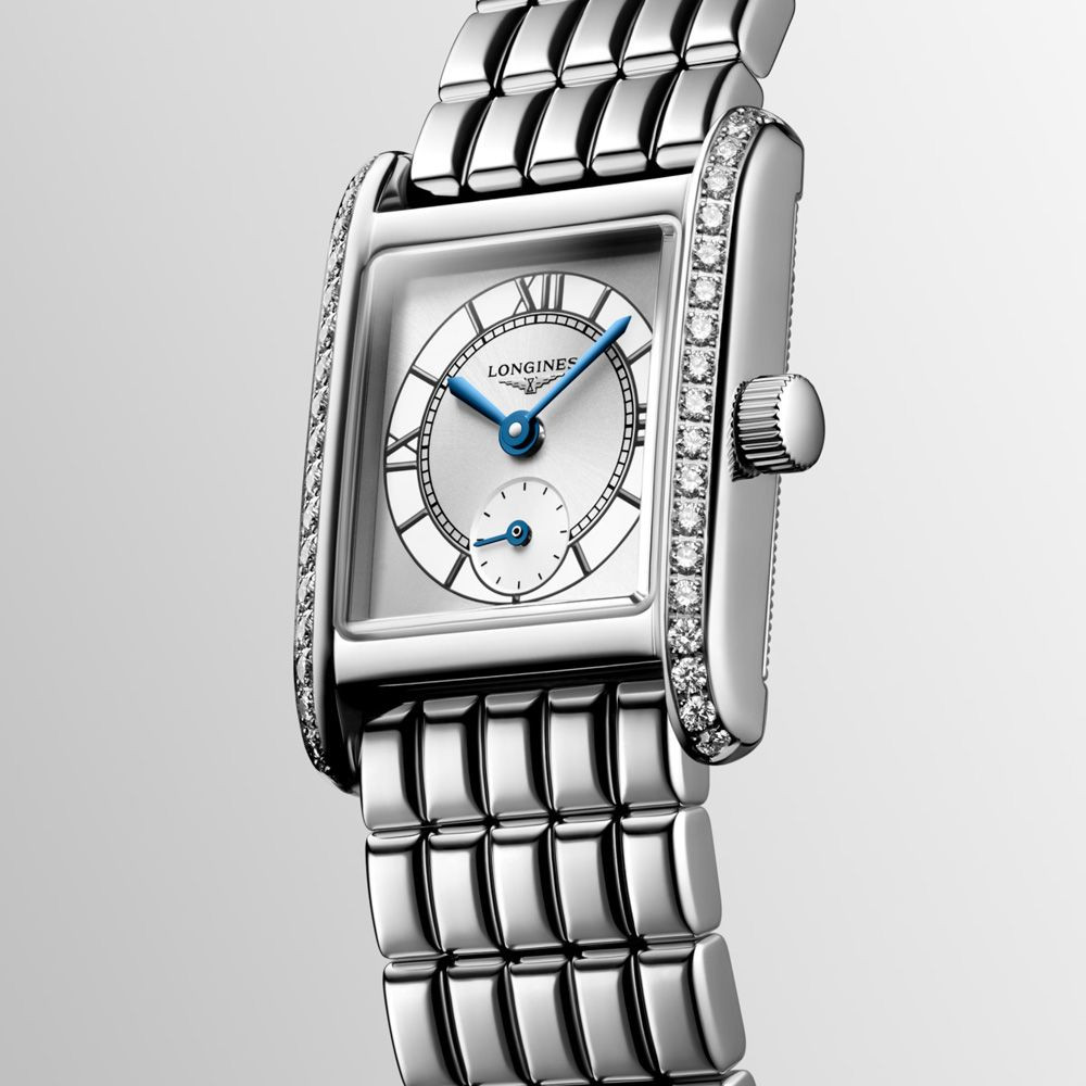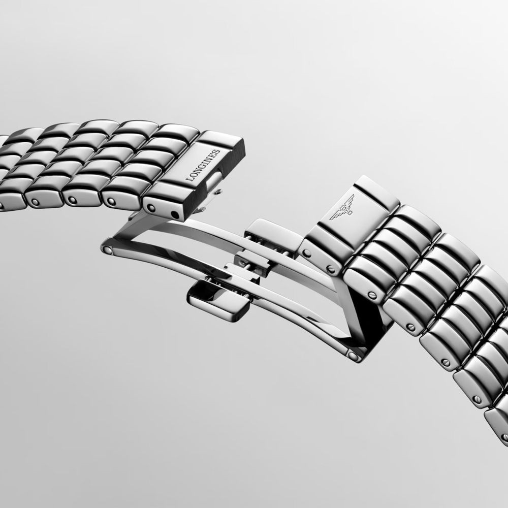 A Longines Mini Dolcevita női karóra L5.200.0.75.6 karóra házának anyaga Nemesacél, színe Ezüst, a szíjának anyaga Nemesacél és a színe Ezüst. Az óratok átmérője 22 mm, alakja Négyszögű. A karóra üvege Zafír (karcolásmentes), szerkezete Kvarc és vízállósága 3 atm (30m) (cseppmentes).