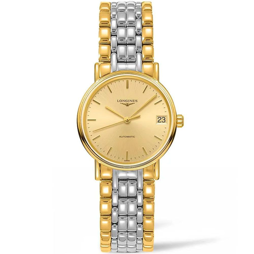 A Longines Présence női karóra L4.322.2.32.7 karóra házának anyaga Nemesacél, színe Arany, a szíjának anyaga Nemesacél és a színe Arany,Ezüst. Az óratok átmérője 30 mm, alakja Kerek. A karóra üvege Zafír (karcolásmentes), szerkezete Automata és vízállósága 3 atm (30m) (cseppmentes).