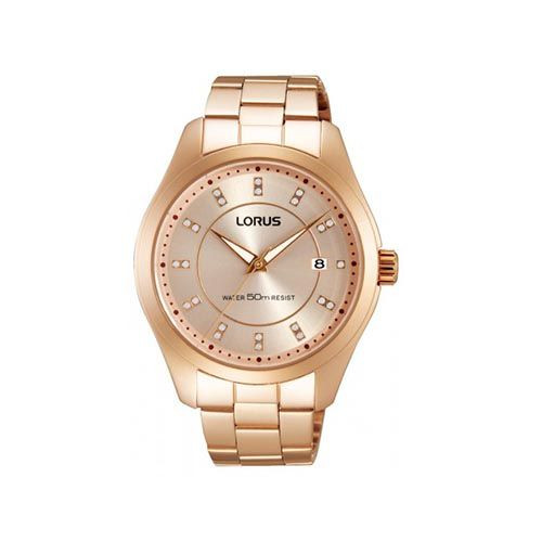 A LORUS óra RH946EX-9 karóra házának anyaga Nemesacél, színe Rose gold, a szíjának anyaga Nemesacél és a színe Rose gold. Az óratok átmérője 38 mm, alakja Kerek. A karóra üvege Kristály (nehezen karcolható), szerkezete Kvarc és vízállósága 3 atm (30m) (cseppmentes).