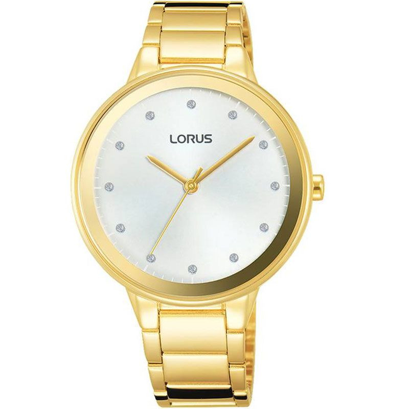 A Lorus Women női karóra RG280LX-9 karóra házának anyaga Fémötvözet, színe Arany, a szíjának anyaga Nemesacél és a színe Arany. Az óratok átmérője 36 mm, alakja Kerek. A karóra üvege Kristály (nehezen karcolható), szerkezete Kvarc és vízállósága 5 atm (50m) (erősen cseppálló).