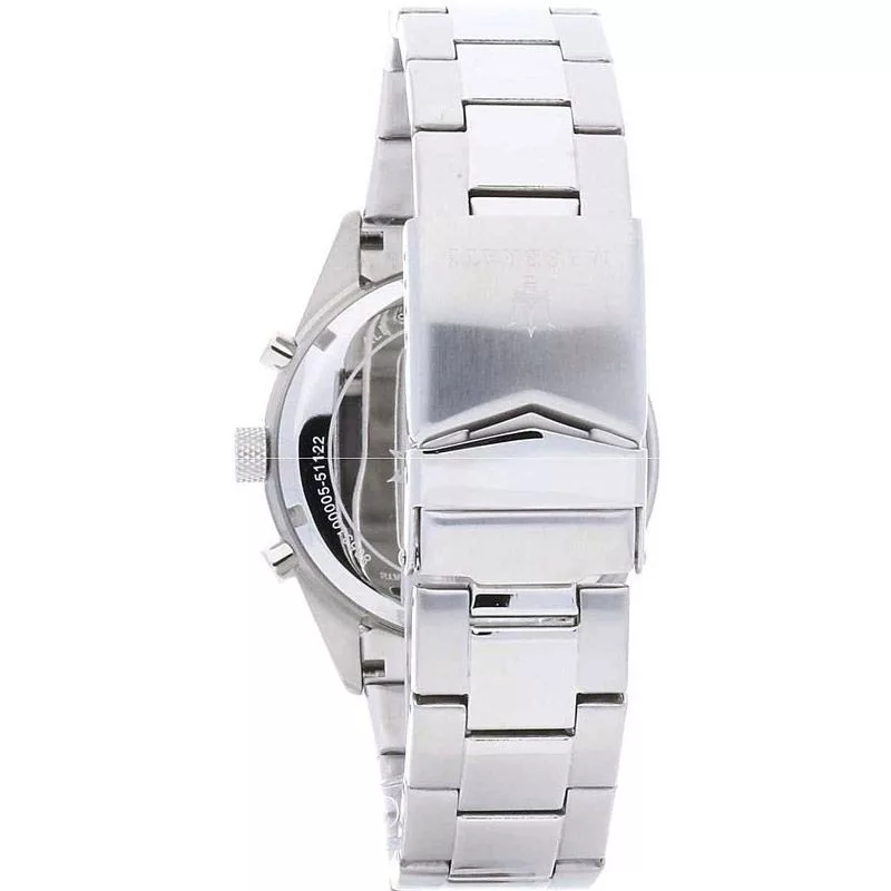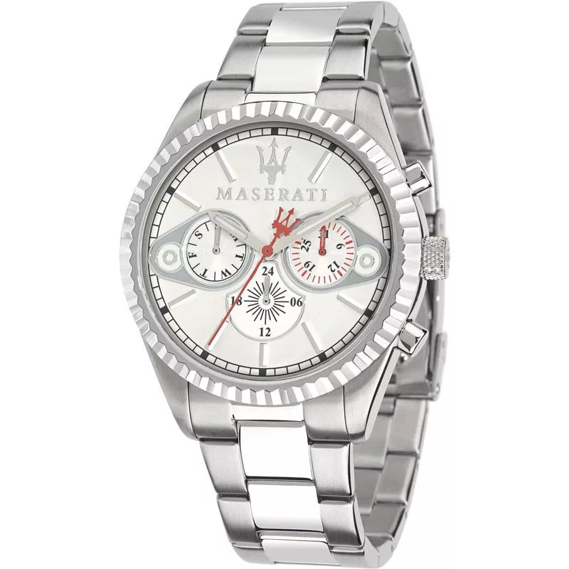 A Maserati Competizione férfi karóra R8853100005 karóra házának anyaga Nemesacél, színe Ezüst, a szíjának anyaga Nemesacél és a színe Ezüst. Az óratok átmérője 43 mm, alakja Kerek. A karóra üvege Kristály (nehezen karcolható), szerkezete Kvarc és vízállósága 10 atm (100m) (úszásra is alkalmas).