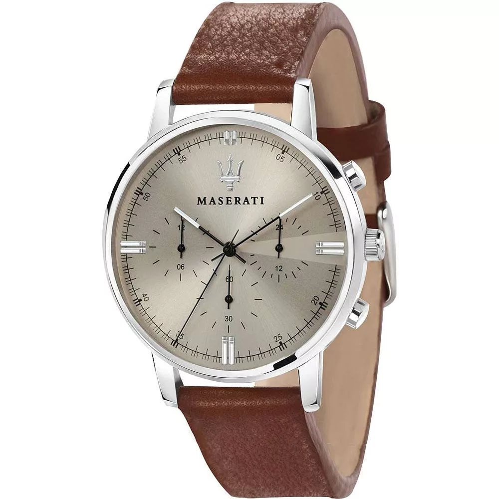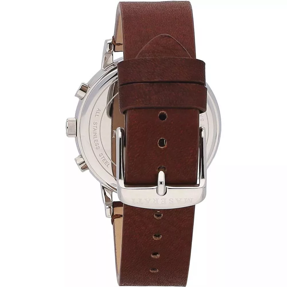 A Maserati Eleganza férfi karóra R8871630001 karóra házának anyaga Nemesacél, színe Ezüst, a szíjának anyaga Bőr és a színe Barna. Az óratok átmérője 42 mm, alakja Kerek. A karóra üvege Kristály (nehezen karcolható), szerkezete Kvarc és vízállósága 5 atm (50m) (erősen cseppálló).