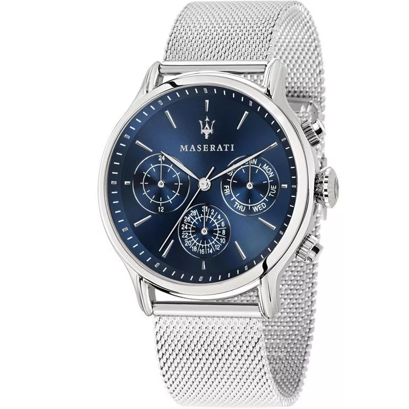 A Maserati Epoca férfi karóra R8853118013 karóra házának anyaga Nemesacél, színe Ezüst, a szíjának anyaga Nemesacél és a színe Ezüst. Az óratok átmérője 42 mm, alakja Kerek. A karóra üvege Kristály (nehezen karcolható), szerkezete Kvarc és vízállósága 10 atm (100m) (úszásra is alkalmas).