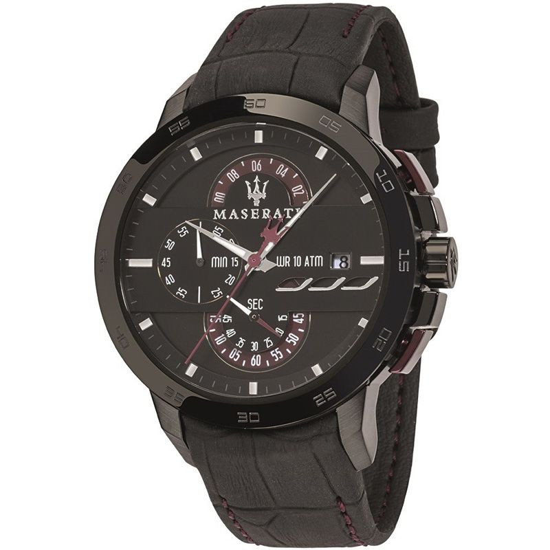 A Maserati férfi karóra R8871619003 karóra házának anyaga Nemesacél, színe Fekete, a szíjának anyaga Bőr és a színe Fekete. Az óratok átmérője 45 mm, alakja Kerek. A karóra üvege Kristály (nehezen karcolható), szerkezete Kvarc és vízállósága 10 atm (100m) (úszásra is alkalmas).